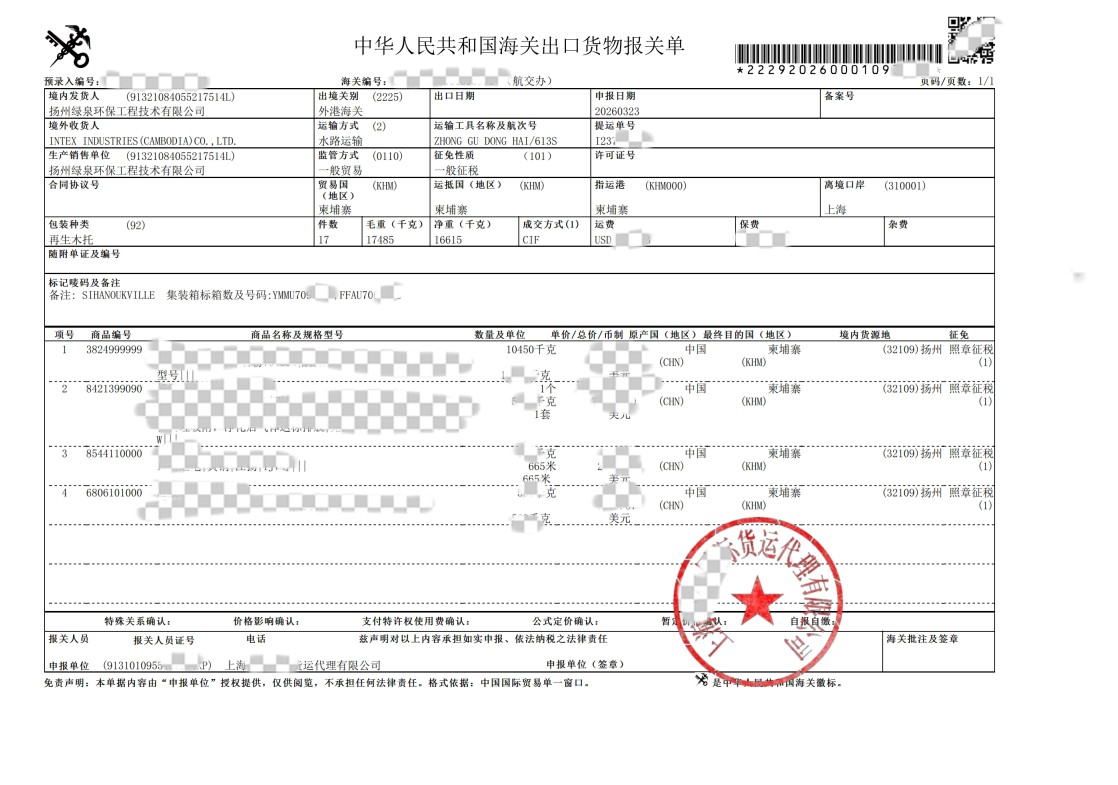 Pozri podrobnosti[Phnom Penh, Kambodža, 22. marca 2026] — Spoločnosť Lvquan Environmental Protection Engineering Technology Co., Ltd. nedávno úspešne dokončila významnú cezhraničnú dodávku, pričom svojmu kambodžskému klientovi, INTEX INDUSTRIES (CAMBODIA) CO., LTD.